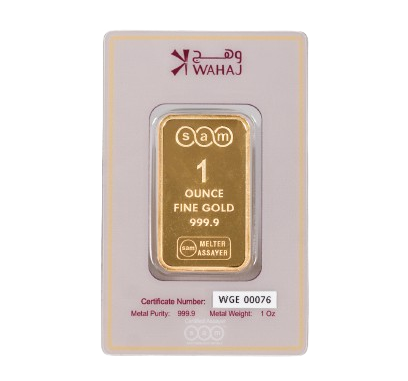 Wahaj 1oz gold bar – made from 999.9 fine gold is a minted gold bullion product refined by SAM Precious Metals, a certified Melter and Assayer in the UAE recognized under the UAE Good Delivery standard.